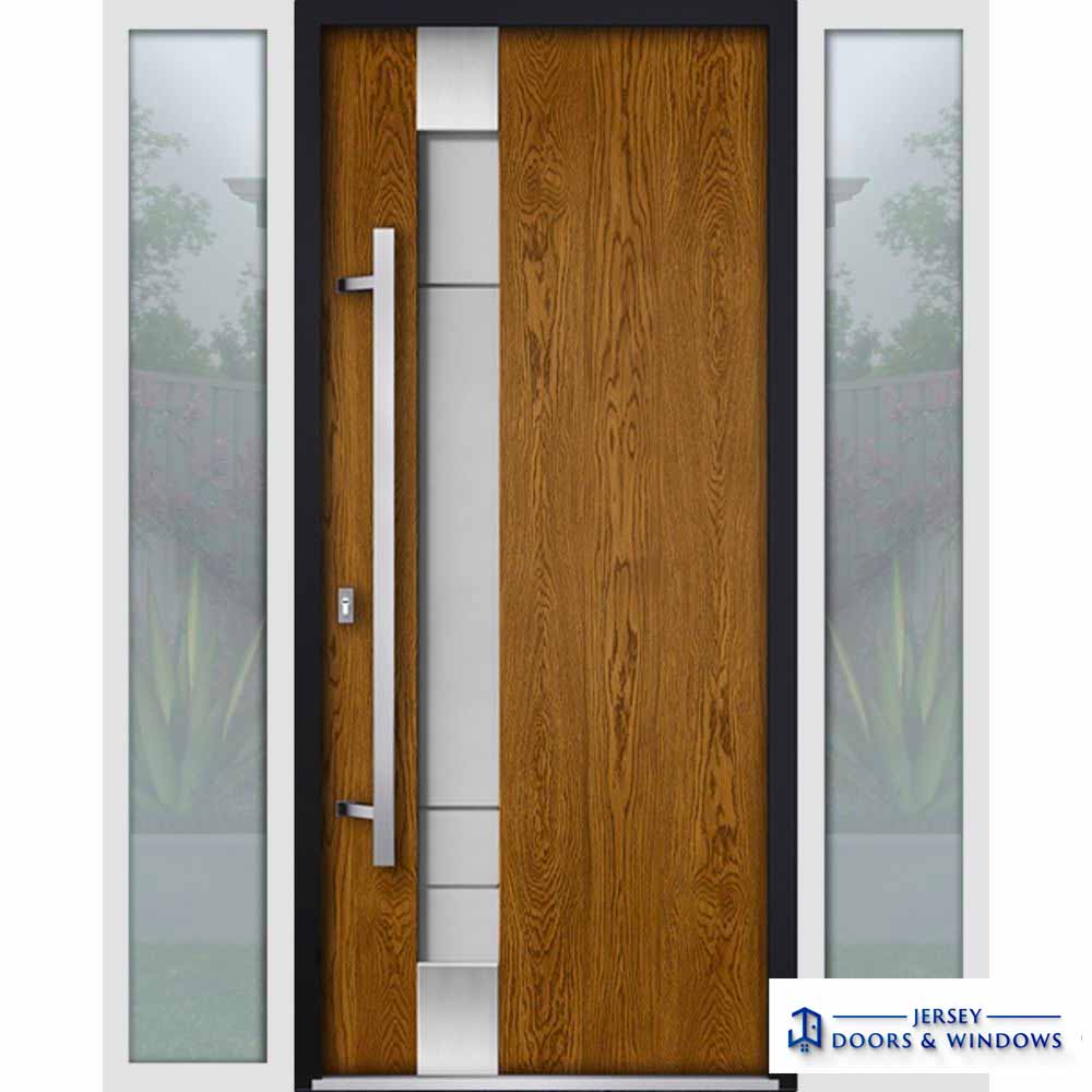 Exterior design – Vertical insert of the stainless steel parts on the top and bottom; frosted glass with clear glass strips in the middle. Coating of the door – Moisture resistant MDF layer 2/3″, oak veneer.