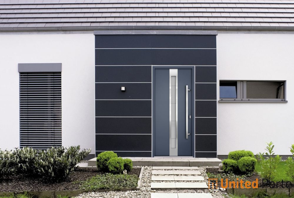 Exterior design – Vertical insert (stainless steel inserts on the top and bottom; frosted glass with see-through strips in the middle). Coating of the door – Moisture resistant MDF layer 2/3″, gray enamel.