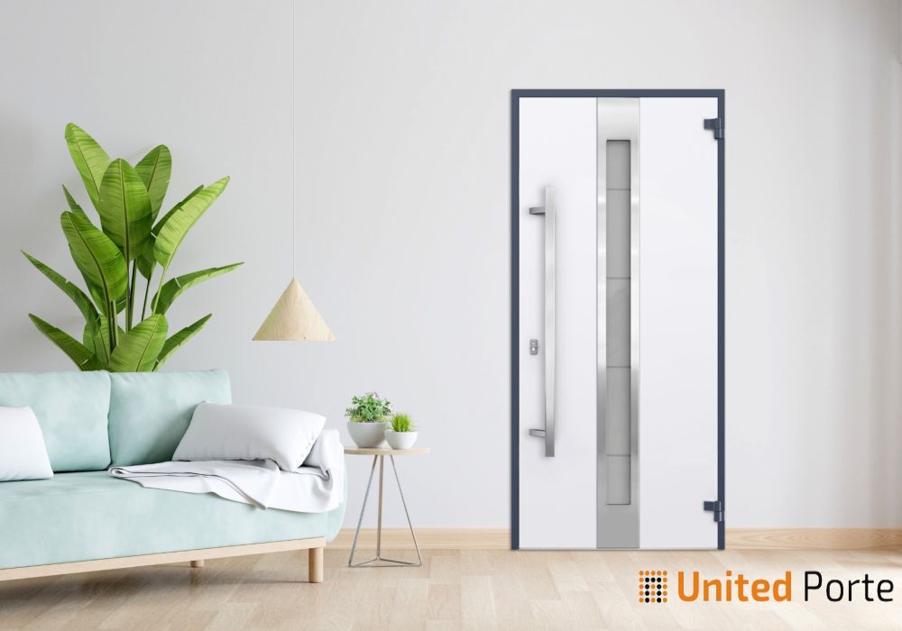 Interior design – Vertical insert (stainless steel inserts on the top and bottom; frosted glass with see-through strips in the middle). Coating of the door – white enamel.