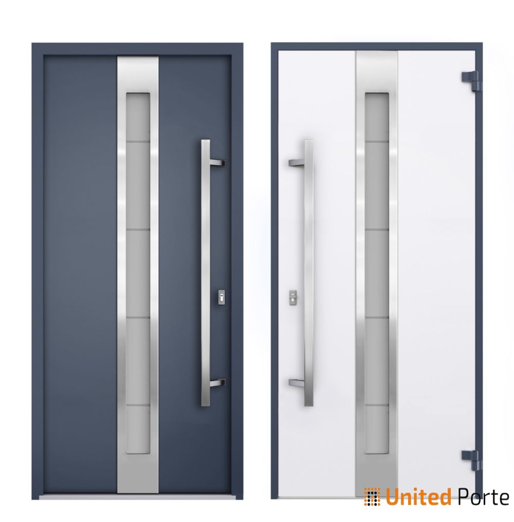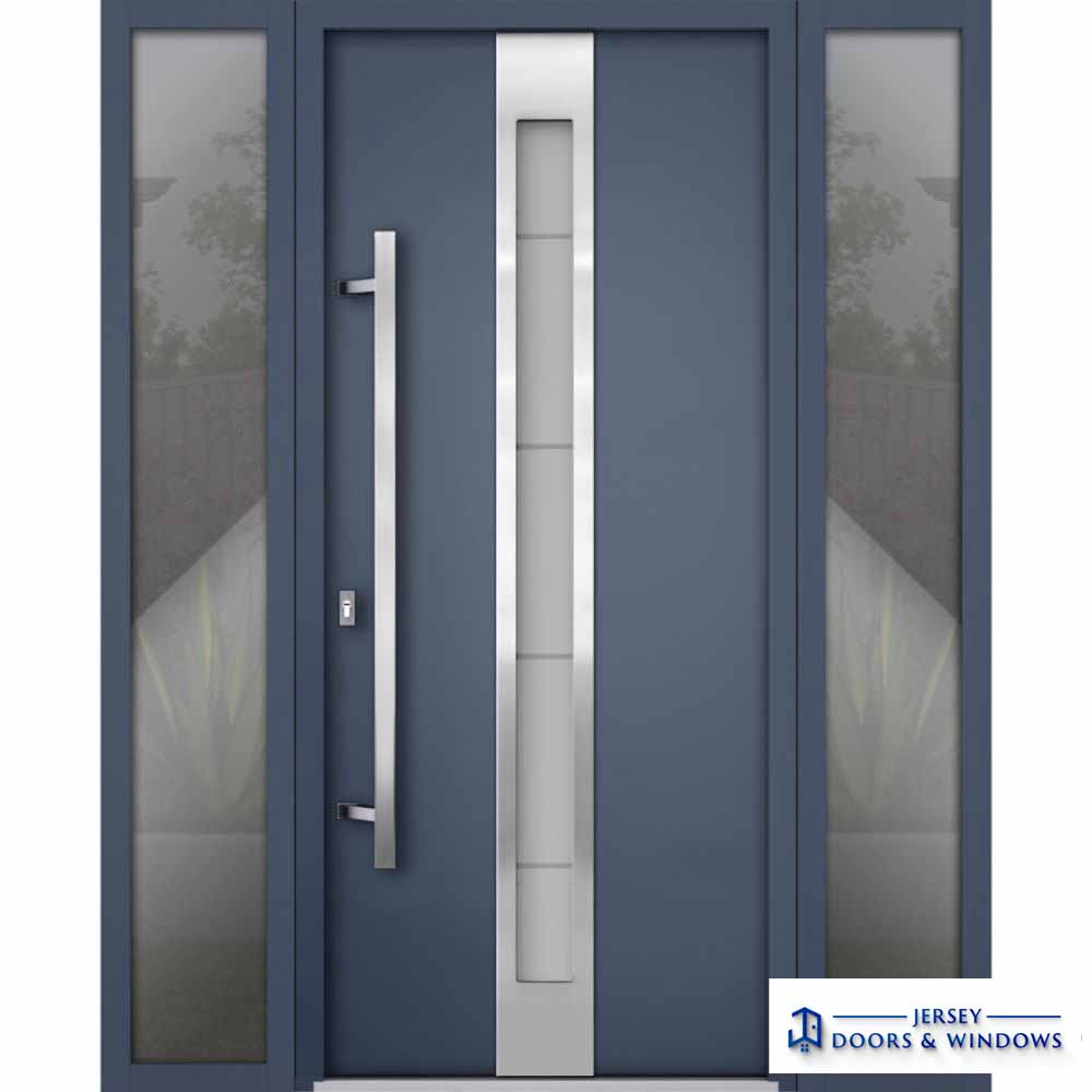 Exterior design – Vertical insert (stainless steel inserts on the top and bottom; frosted glass with see-through strips in the middle). Coating of the door – Moisture resistant MDF layer 2/3″, gray enamel.