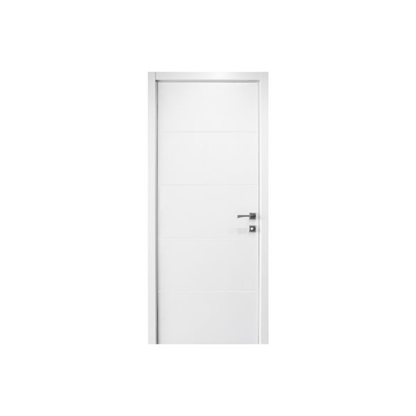 The Jersey Doors and Windows Graffiti Soft White interior doors fit a wide variety of spaces with a subtle look that easily balances between contemporary and traditional styles. The ultra-smooth, laminated white door is artfully interrupted by four skinny grooves that slice across horizontally. Each line matches in width and is equally spaced for a balanced, calming effect.